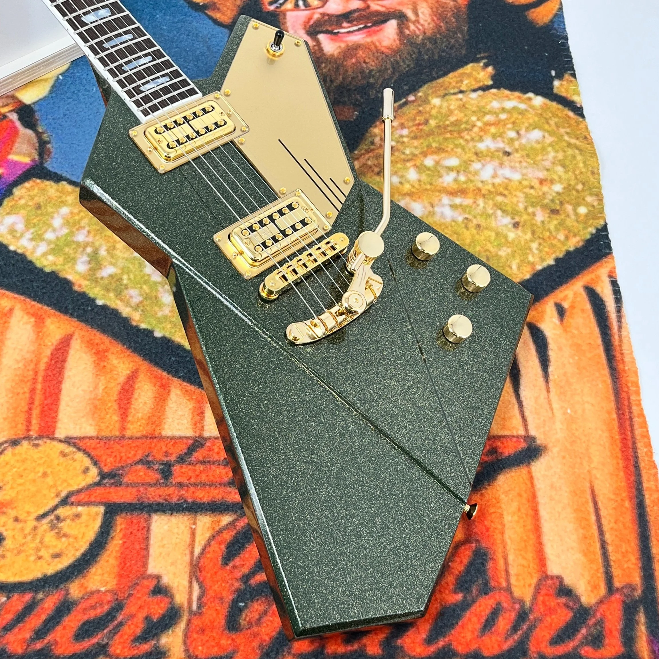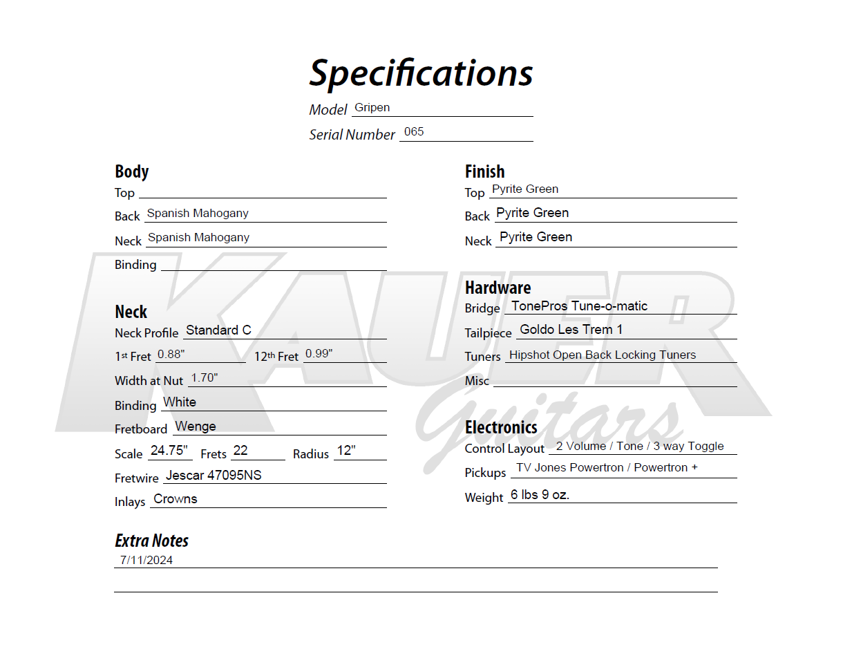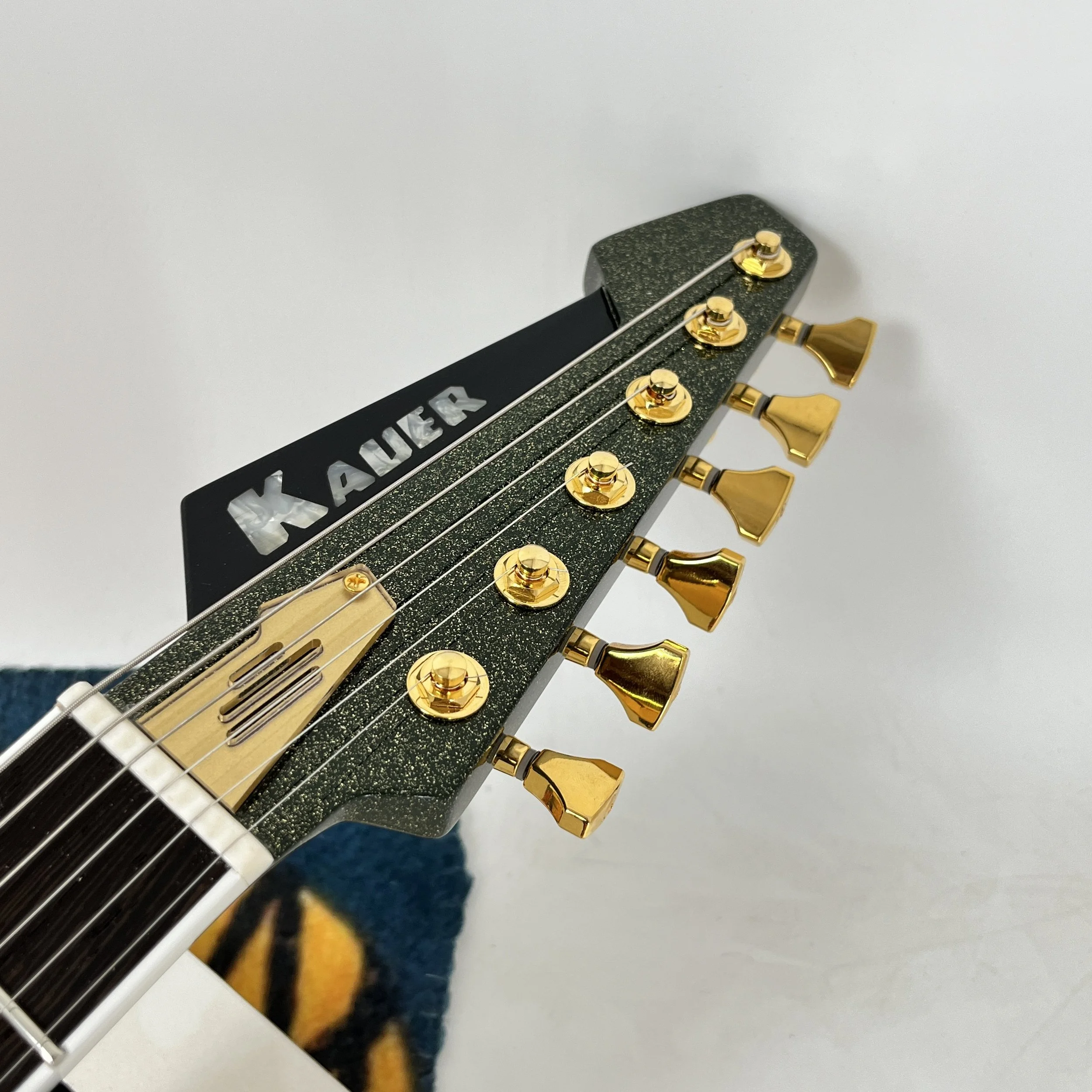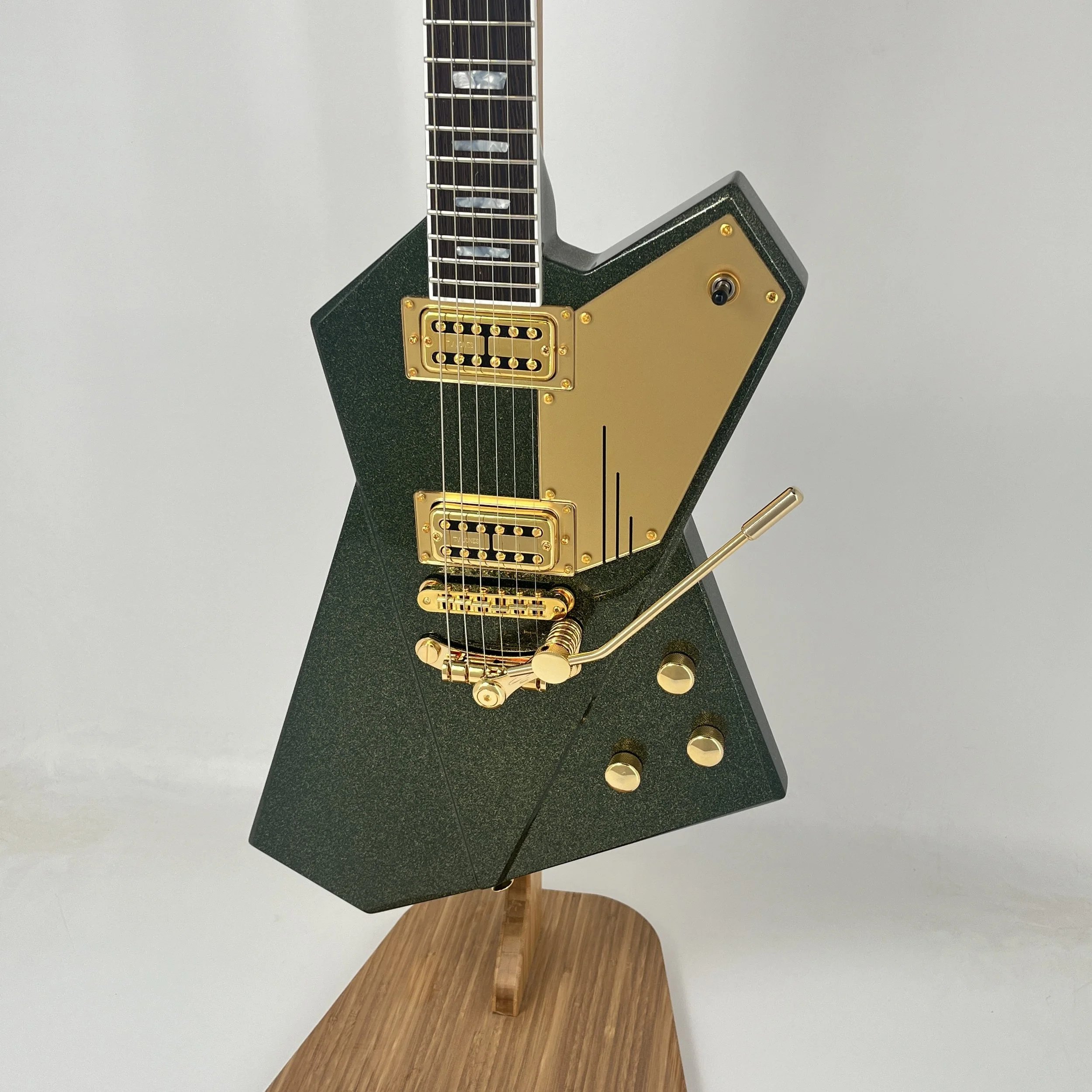 How do you take the already amazing Caddy Green and take it up a notch? Dust it in gold metal flake! We dubbed this finish Pyrite as it sparkles like fools gold. We’re LOVING these newly available (to us) Les Trem vibrato’s as an excellent bolt on, reversible option for Gripen.