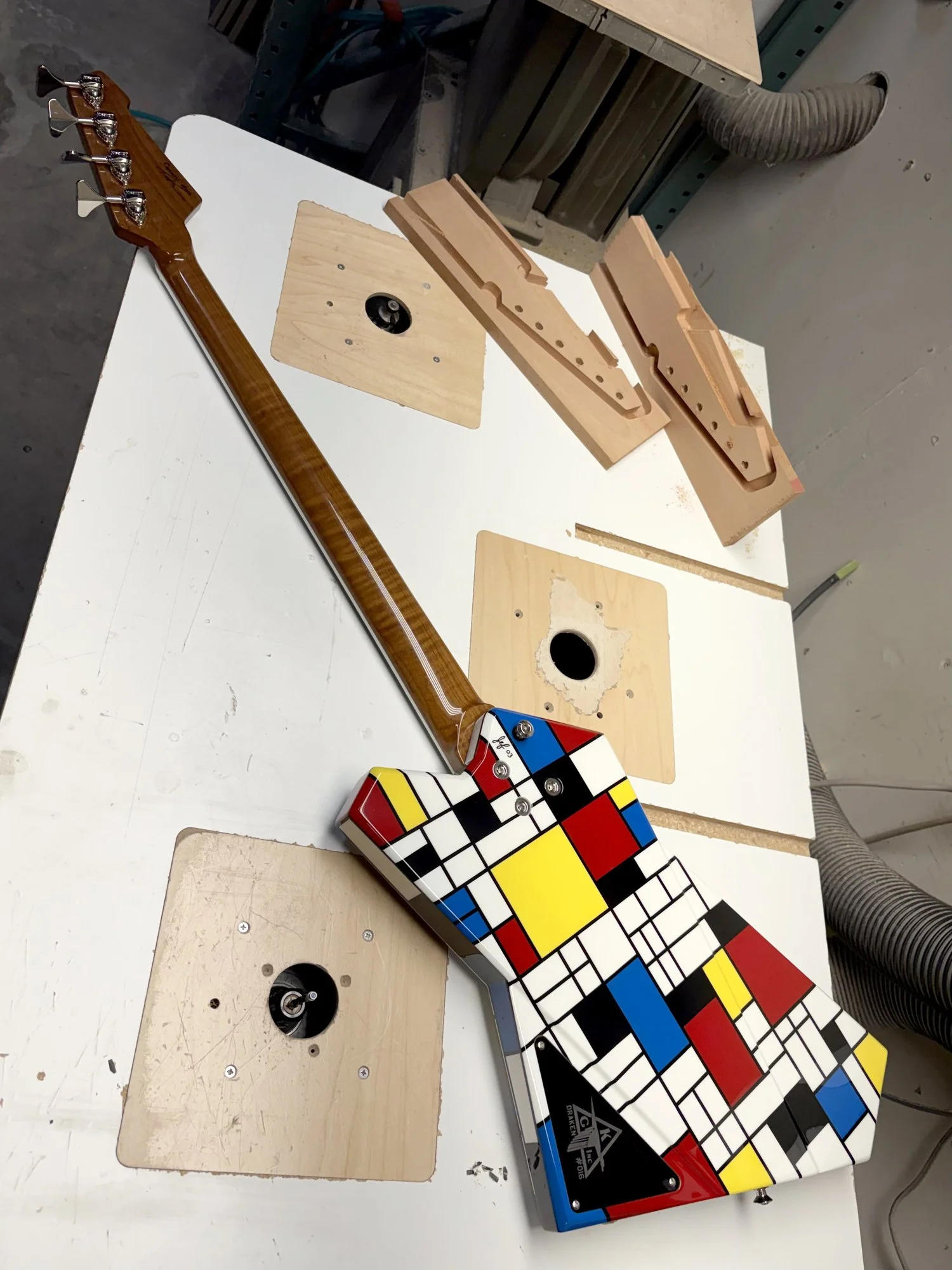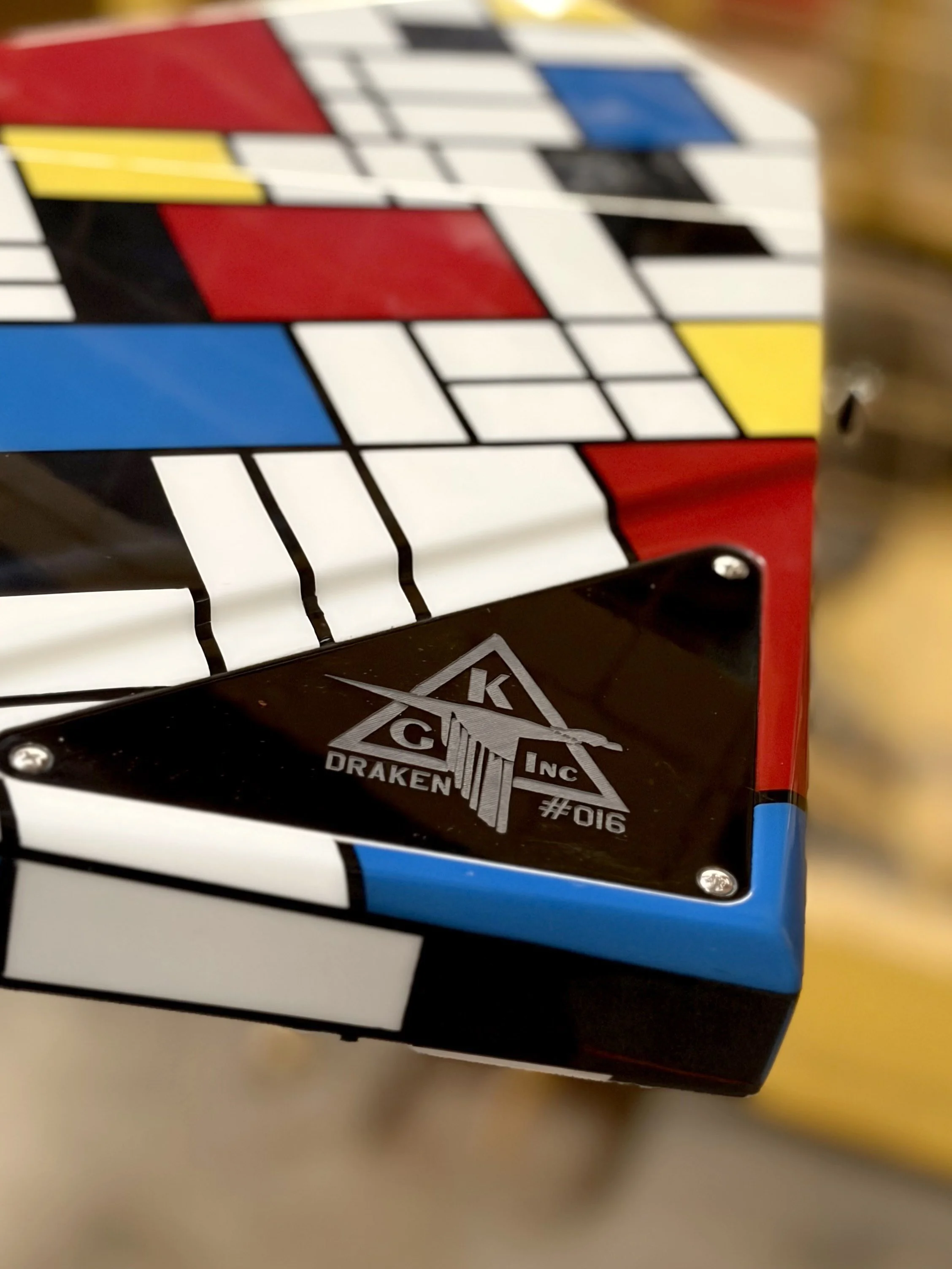 Rounding out… angle’ing out the NOMMdrian lineup is this Draken. Mondrians style fits perfectly with the angular nature of Draken, perfectly accenting all of it’s beveled edges. The carbon reinforced roasted maple neck topped of with a matching headstock is elegance personified.
