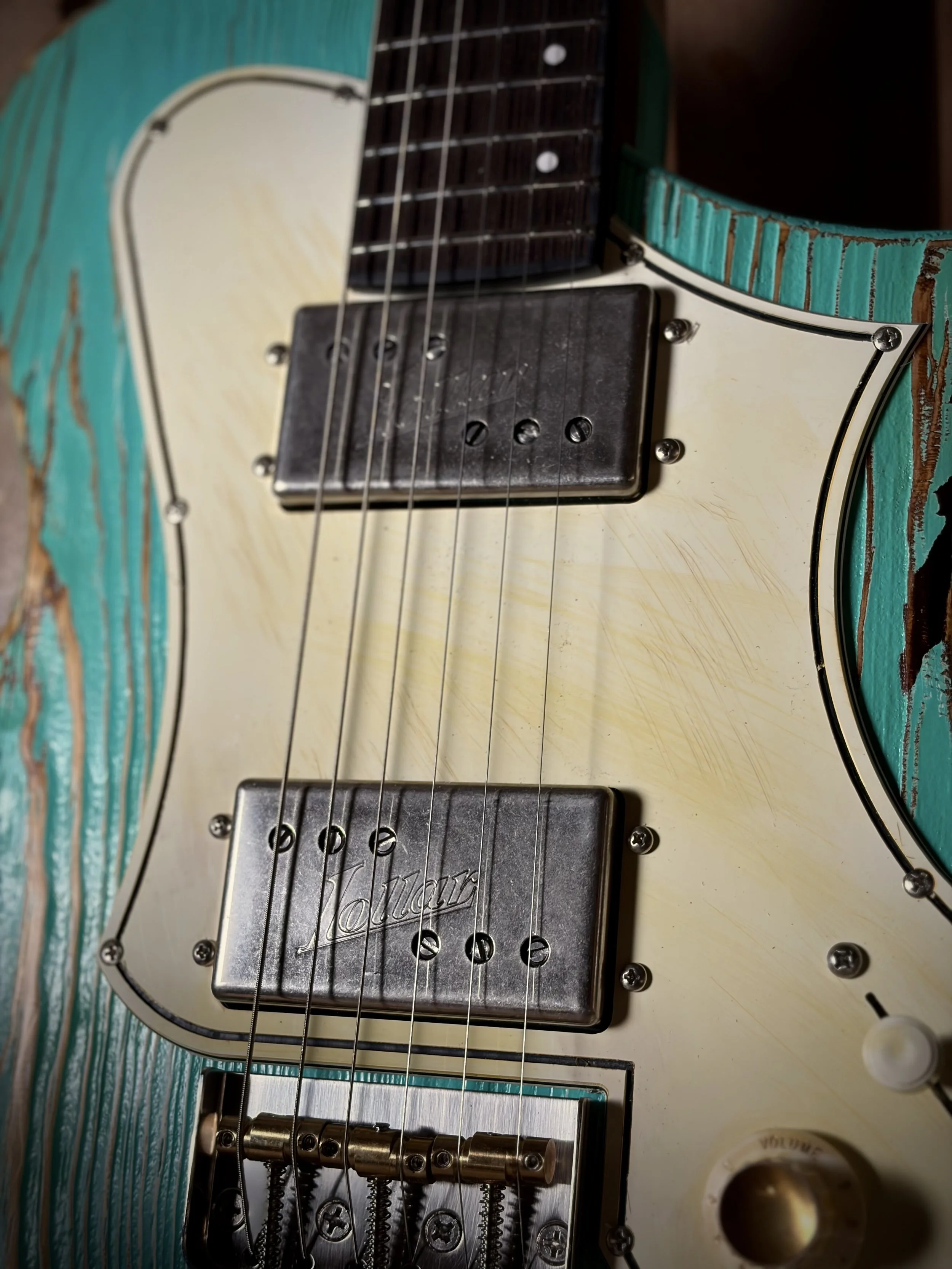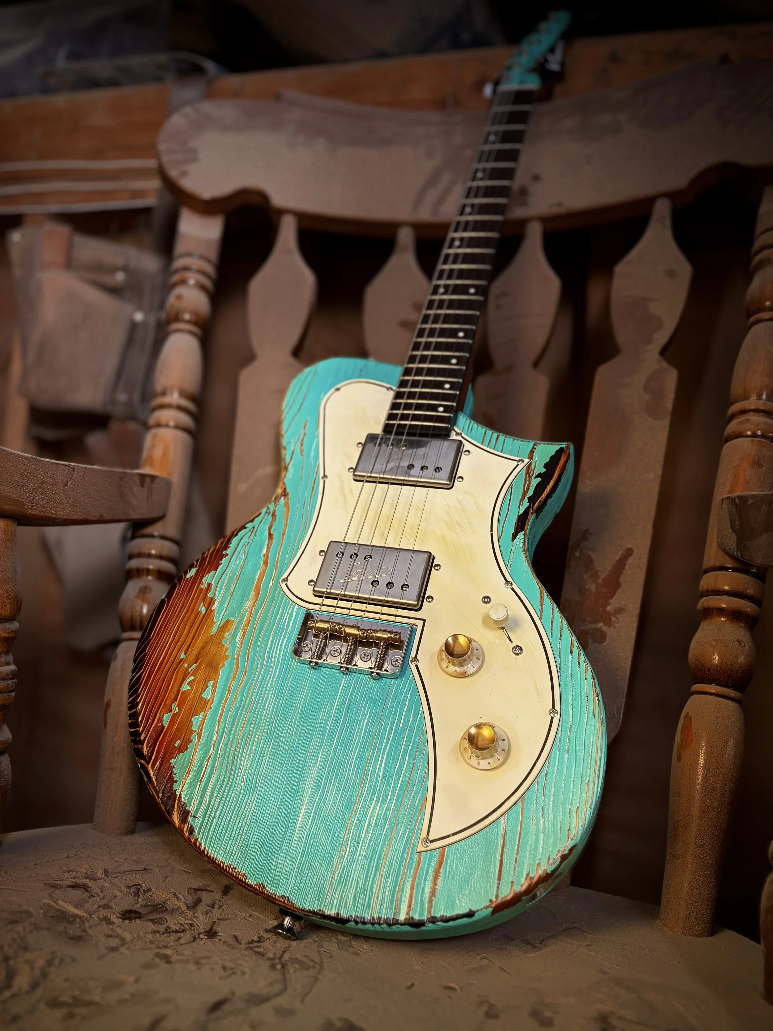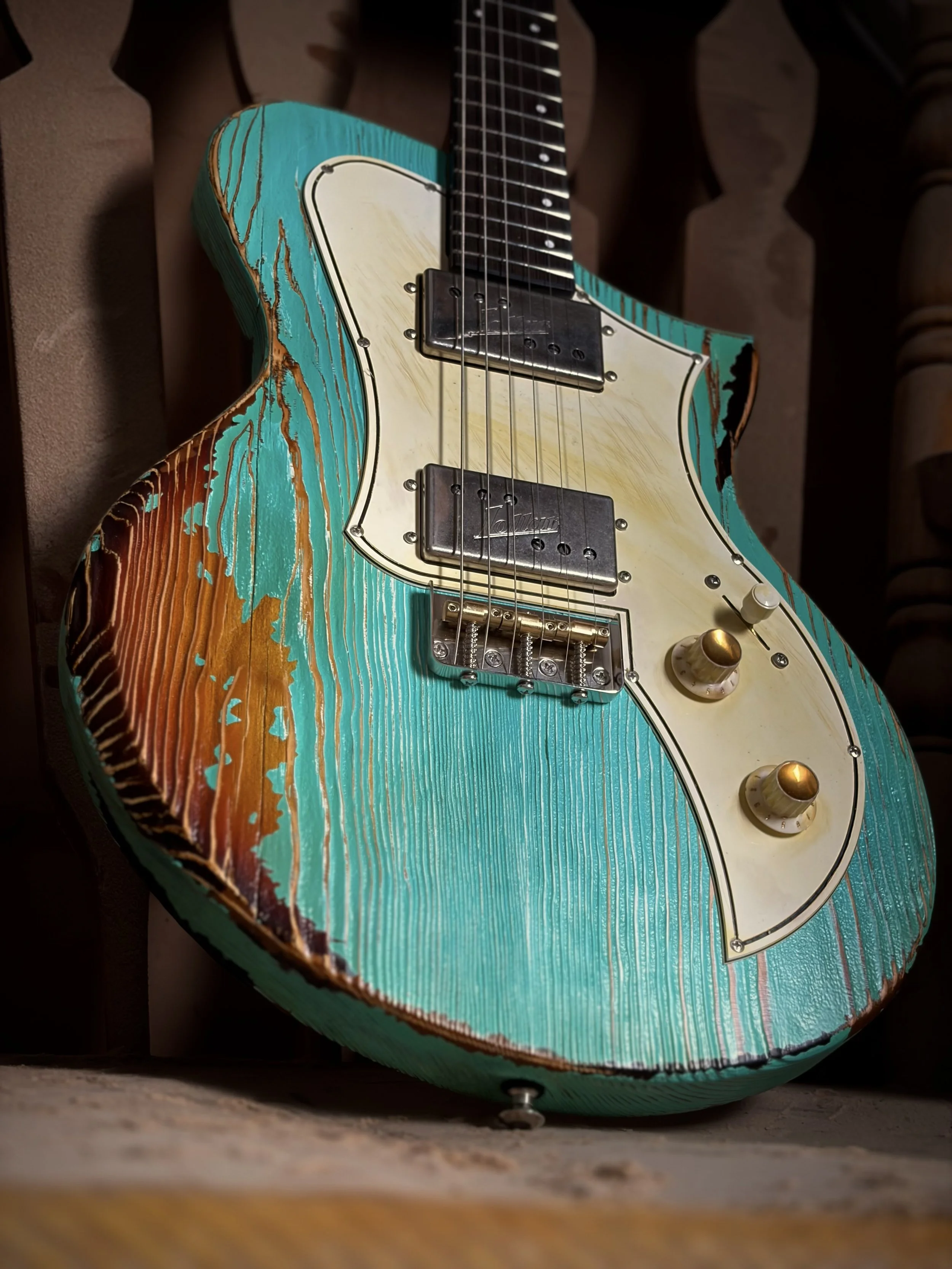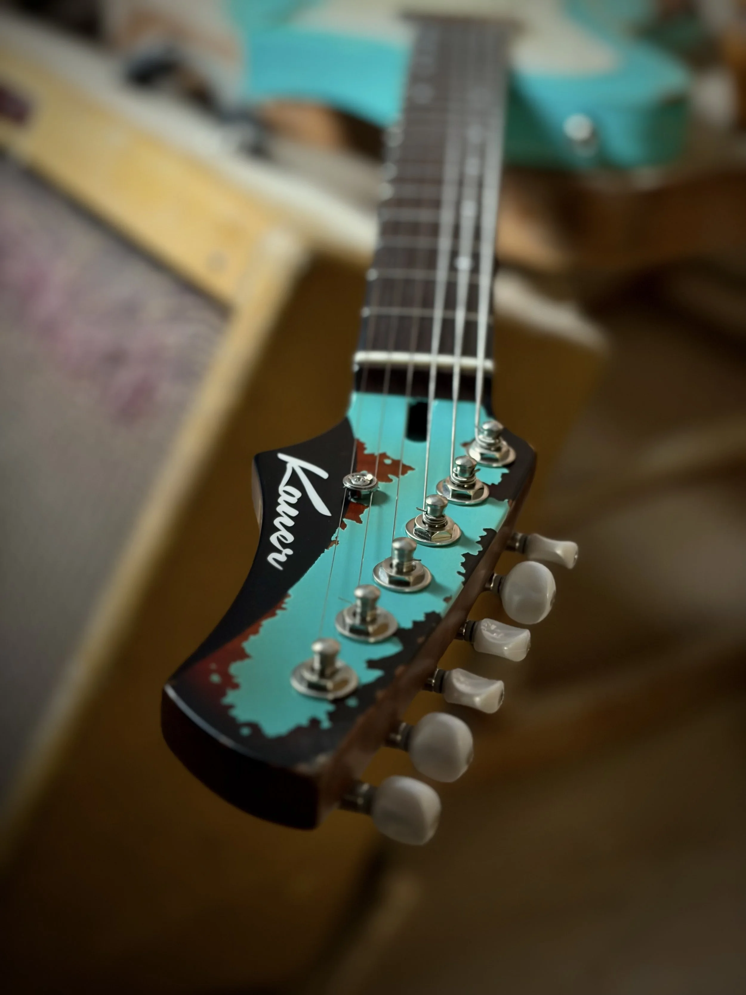 This is the weathered Korona to grab. Korona classic with Lollar Regals and the best sounding color on earth SeaFoam Green but over sunburst and weathered! In a twist, it’s Korona classic but with the extra contouring from Korona-T’s.