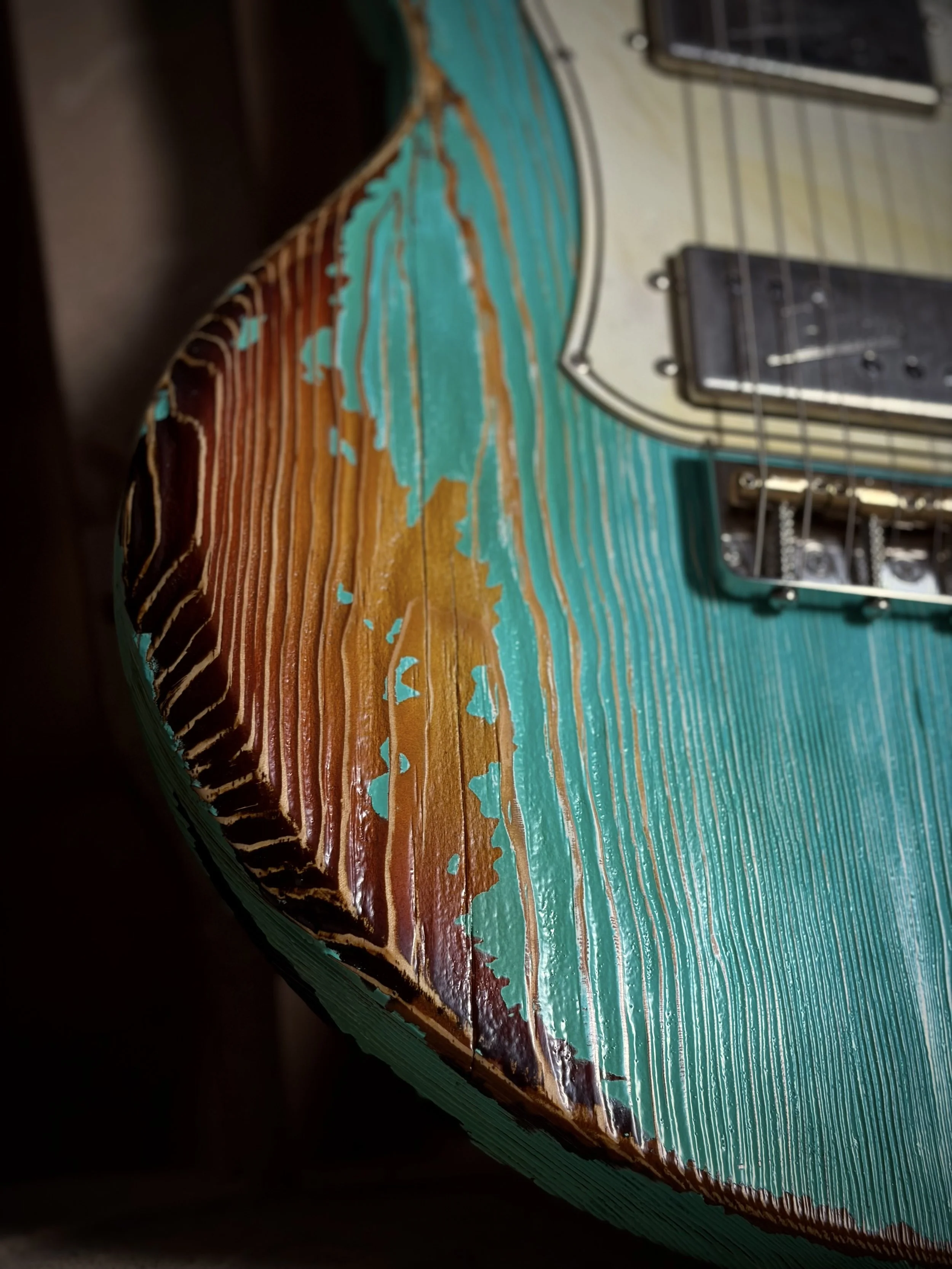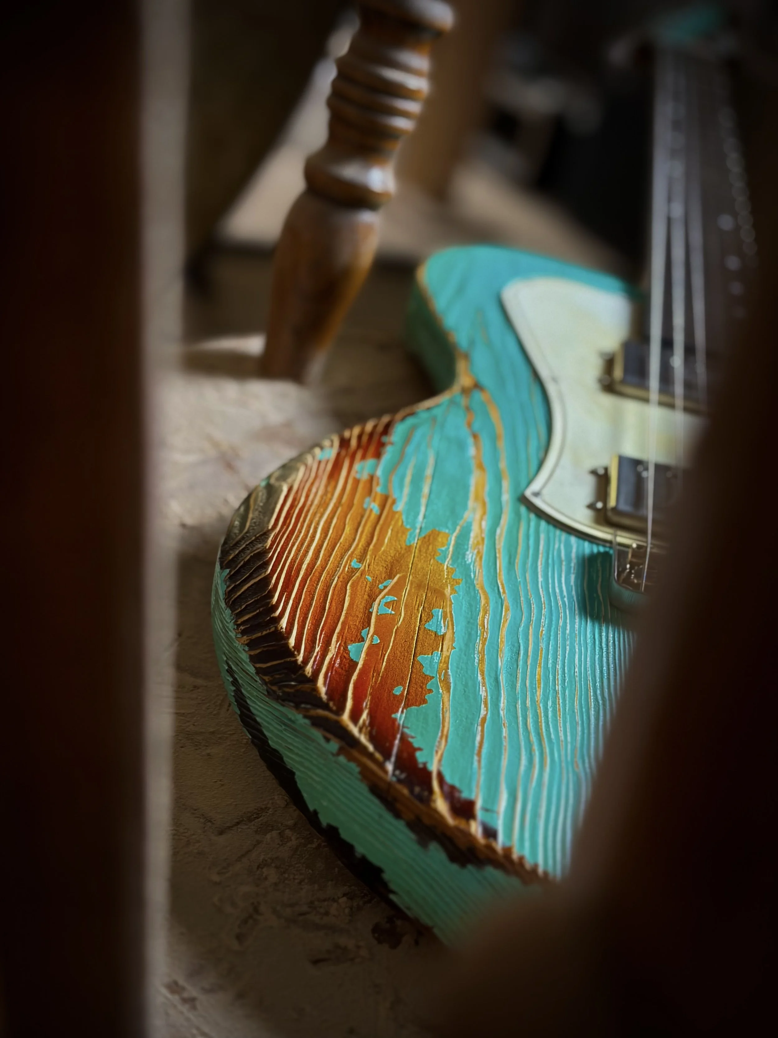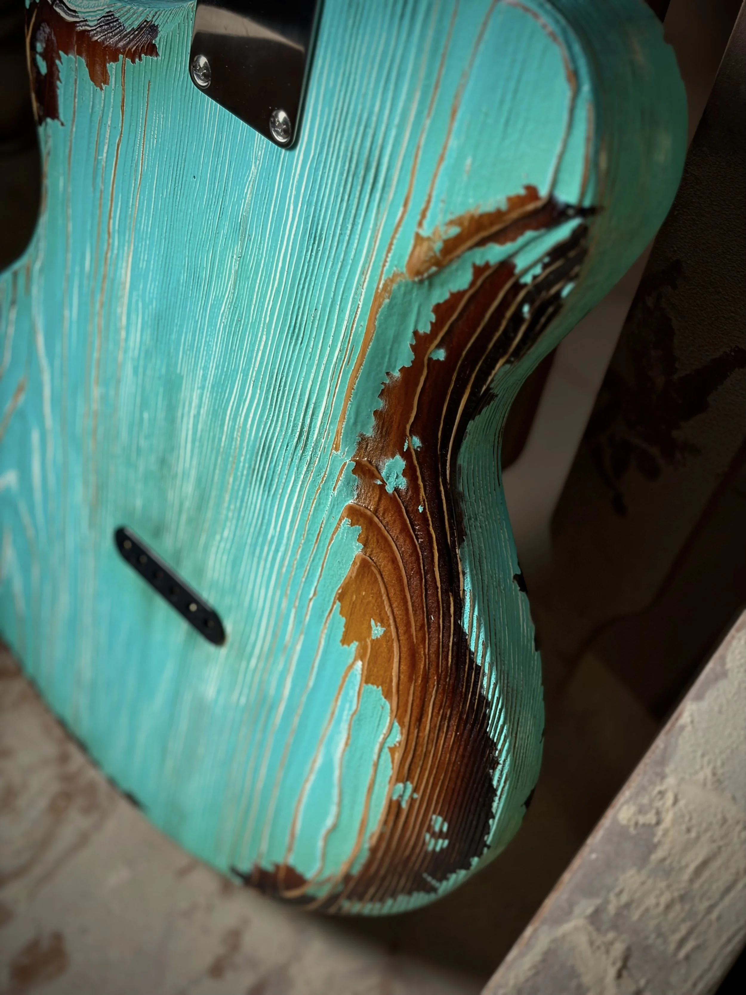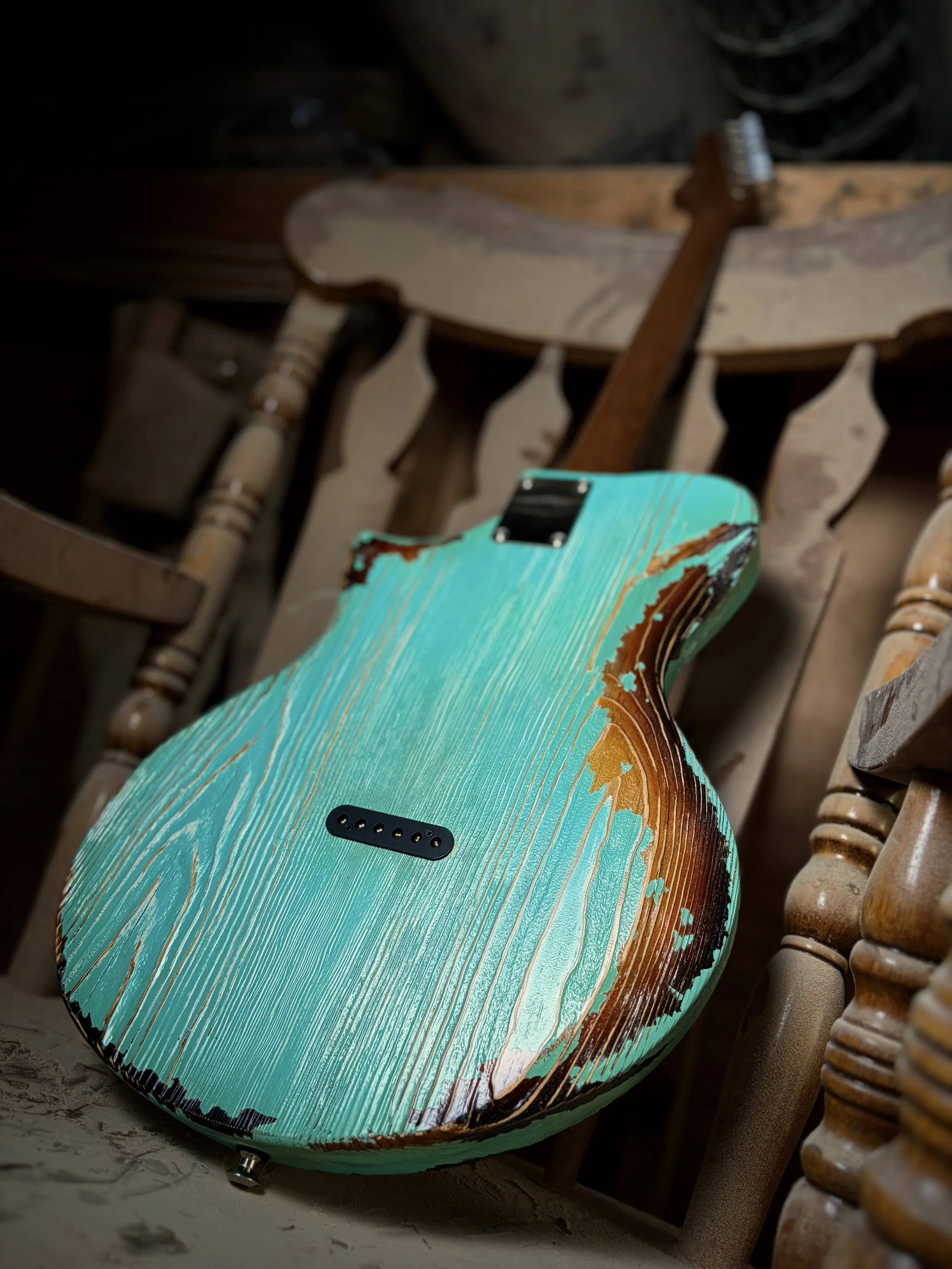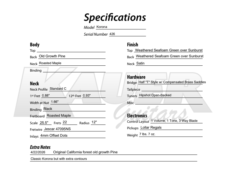 This is the weathered Korona to grab. Korona classic with Lollar Regals and the best sounding color on earth SeaFoam Green but over sunburst and weathered! In a twist, it’s Korona classic but with the extra contouring from Korona-T’s.
