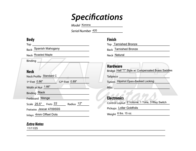 Brand new for 2026 the Korona T is our love letter to that classic T-Style of our youth. This reimagined Korona features a T-style control plate with angled switch to solve that classic switch/volume pot clearance issue and beveled arm and cutaway for maximum comfort. Featuring a half t-style bridge, Spanish Mahogany body for that classic mid-growl and Lollar Goldfoils in our absolutely favorite new finish for this year, Tarnished Bronze.