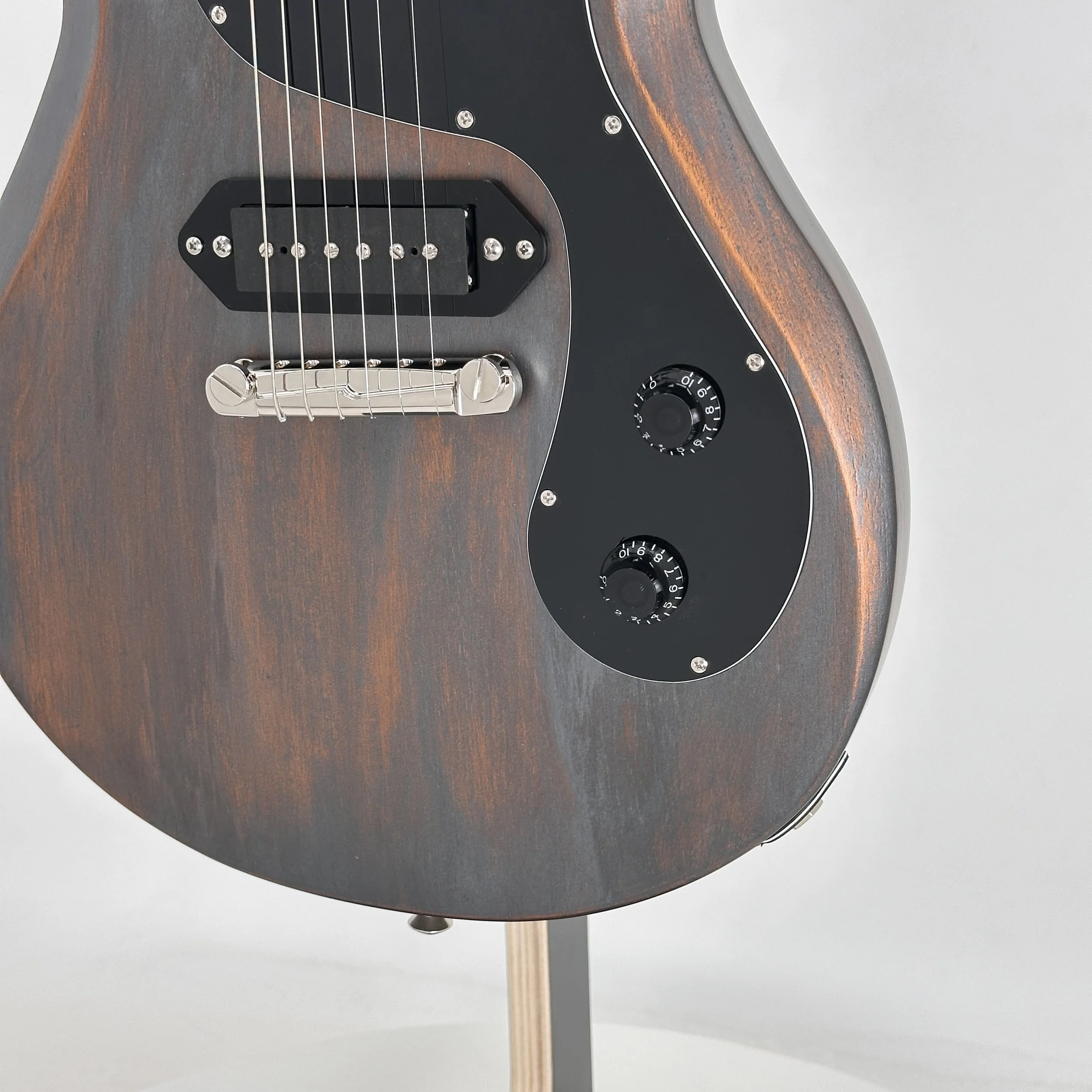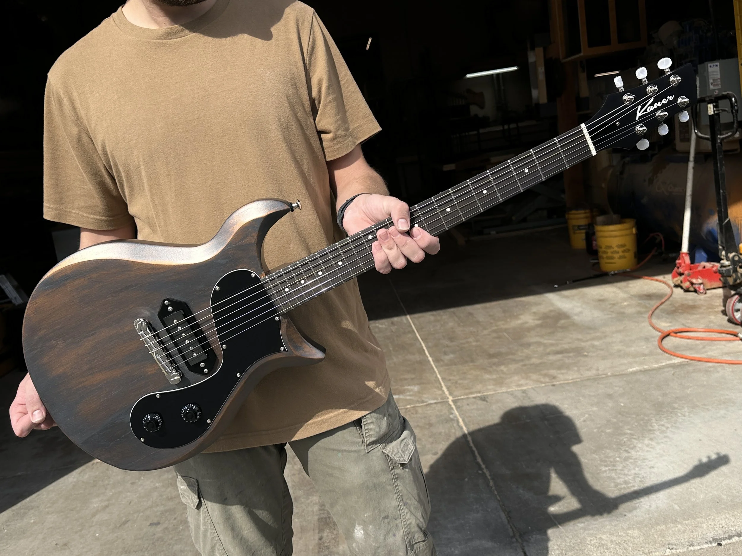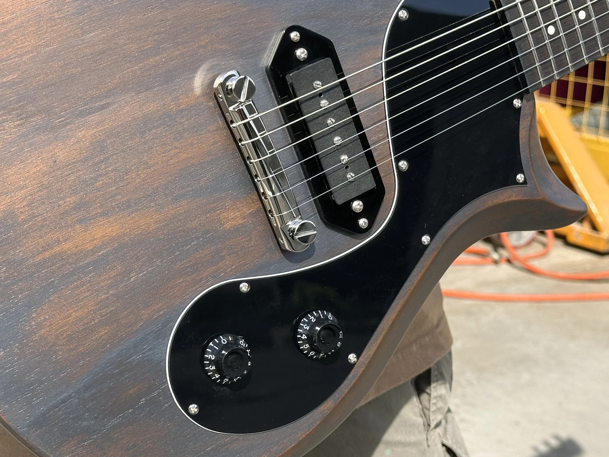 We cooked this finish up recently on a customer suggestion and it’s become a shop favorite, this Tarnished Bronze Skylark looks like it came from the Land before Time. In a killer twist, we took Doug’s favorite Lollar - The Chicago Steel - a lapsteel pickup and made our own dogear style ring making it both easily height adjustable and sneaky from a distance. The CS is just the biggest p90 you’ve ever heard.